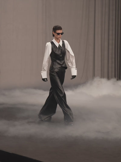 A modern three-piece tailored set featuring a crisp cotton poplin long-sleeve shirt with a pointed collar, origami-inspired sleeve pleats, and elongated cuffs. Layered with a vegan leather longline vest with a deep plunging neckline and leather-covered buttons, finished with high-waisted leather trousers in a straight wide-leg silhouette with a refined front seam.