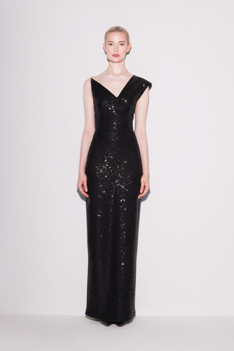 Crafted in sequin fabric, this fitted gown showcases an asymmetric neckline with a structured shoulder—modern elegance with timeless appeal.