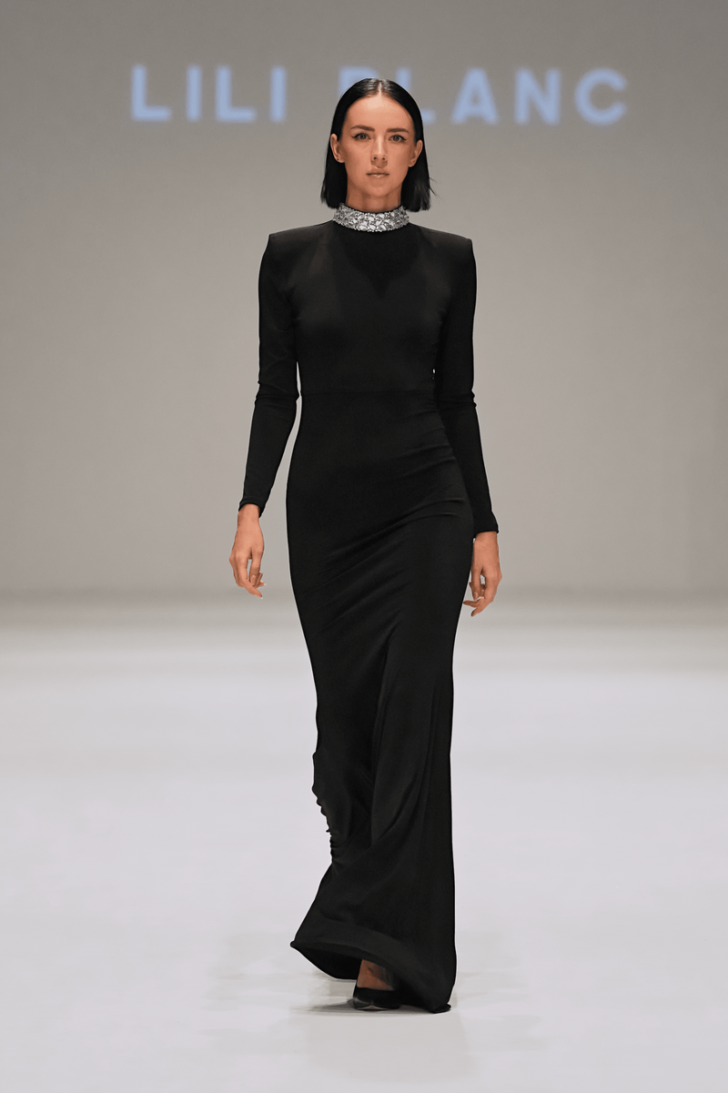 An extravagant floor-length evening dress in black jersey fabric. The neck is embellished with Crystal embroidery. Finished with a backless detailing.