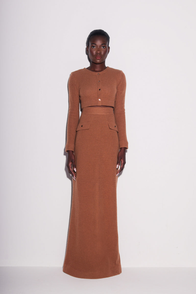 This knit pencil skirt combines sophistication with modern flair. Sitting high, it features structured flap details, decorative buttons, and a discreet side zipper—perfect with the matching crop top for a polished ensemble.