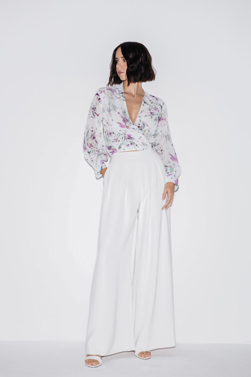 This floral printed chiffon cropped crossover blouse features soft sleeves and crystal applications on the cuffs, adding a touch of elegance to its flowing silhouette. Styled as part of the Chic Retreat Set, this blouse brings effortless sophistication to the ensemble.