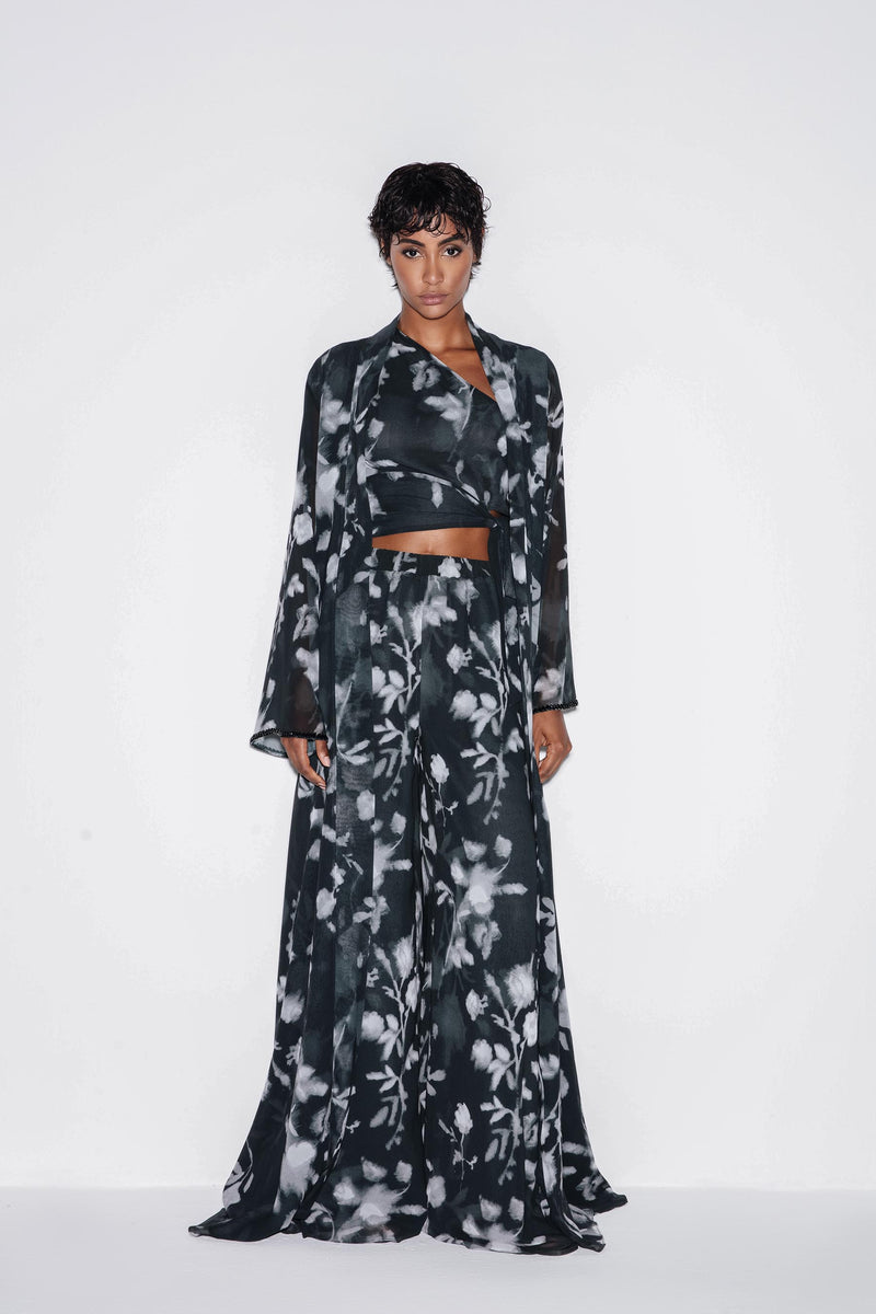 Elevate your style with our "Chiffon Blossom Luxe Co-ord." This stunning ensemble features an allover printed chiffon maxi kimono with wide sleeves and a waistbelt, adorned with crystal applications on the sleeve hems. The asymmetrical top with a single shoulder and knot details pairs beautifully with high-waisted wide-leg trousers that showcase crystal embellishments along the side seam, creating a cohesive and luxurious look perfect for any occasion.
