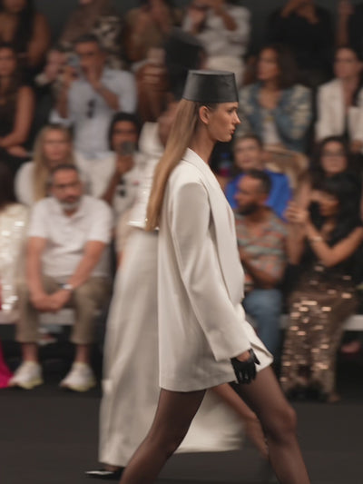 Embrace modern elegance with our straight-cut blazer-inspired dress featuring a relaxed, slightly oversized silhouette. The asymmetric lapel construction with an exaggerated single-side and extended lapel panel enhances its unique style. Structured shoulders and clean tailoring complete the look, while the above-the-knee length adds a chic touch. Crafted from thick crepe for a luxurious feel.