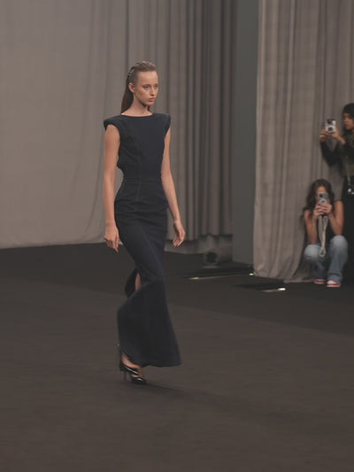 Make a statement in our elegant denim pencil dress featuring a sharp, padded straight shoulder line and a minimalistic boat neckline. The fitted waist shape construction enhances your silhouette, while the long pencil shape with a floor-length hem and back cut-out detail adds a touch of sophistication. Crafted from durable denim.