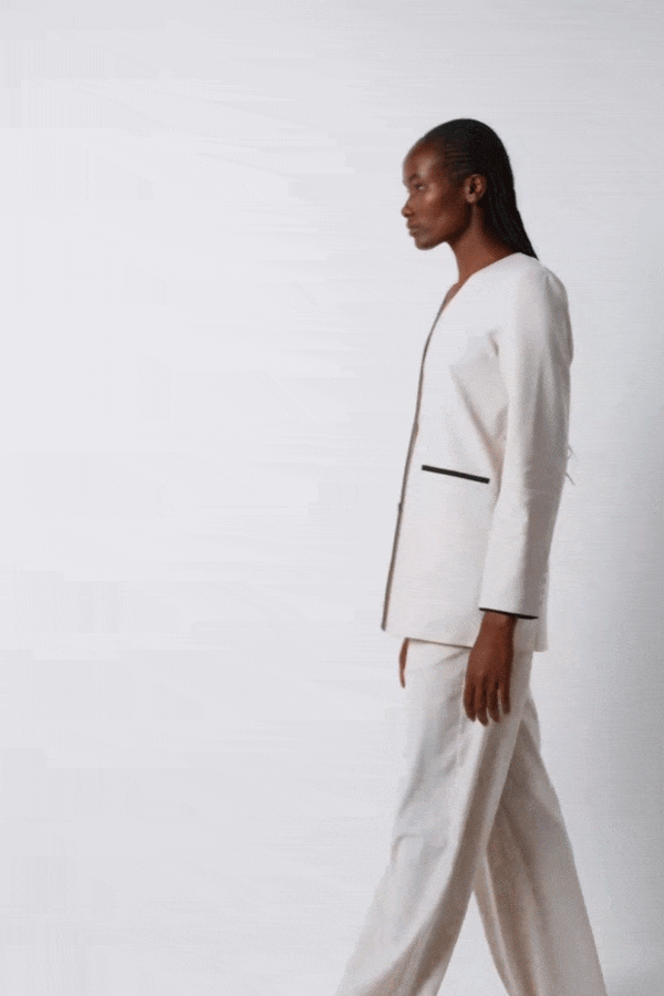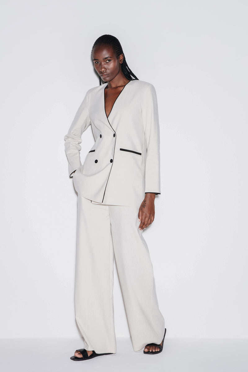 Refine your wardrobe with our "Elegant Retreat Suit." This sophisticated linen ensemble features a straight-fit blazer with contrasting piping and a stylish braided waist belt, complemented by high-waisted straight-leg trousers, creating a polished and effortlessly chic look for any occasion.