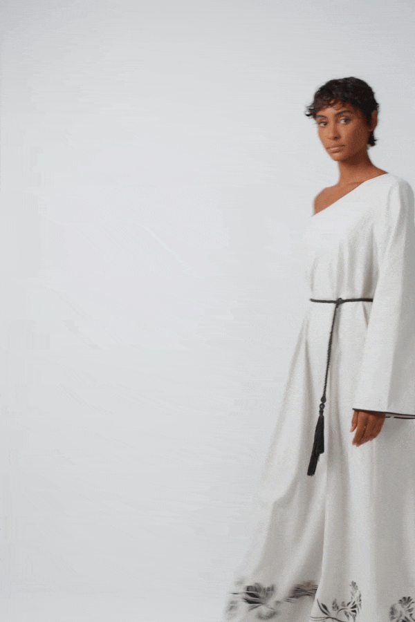 Step into sophistication with our "Embroidered Linen Maxi Dress." This luxurious linen design features a striking asymmetrical silhouette with a single wide sleeve, a braided waist belt for a flattering fit, and delicate floral embroidery along the hem, creating a stunning look for any occasion.