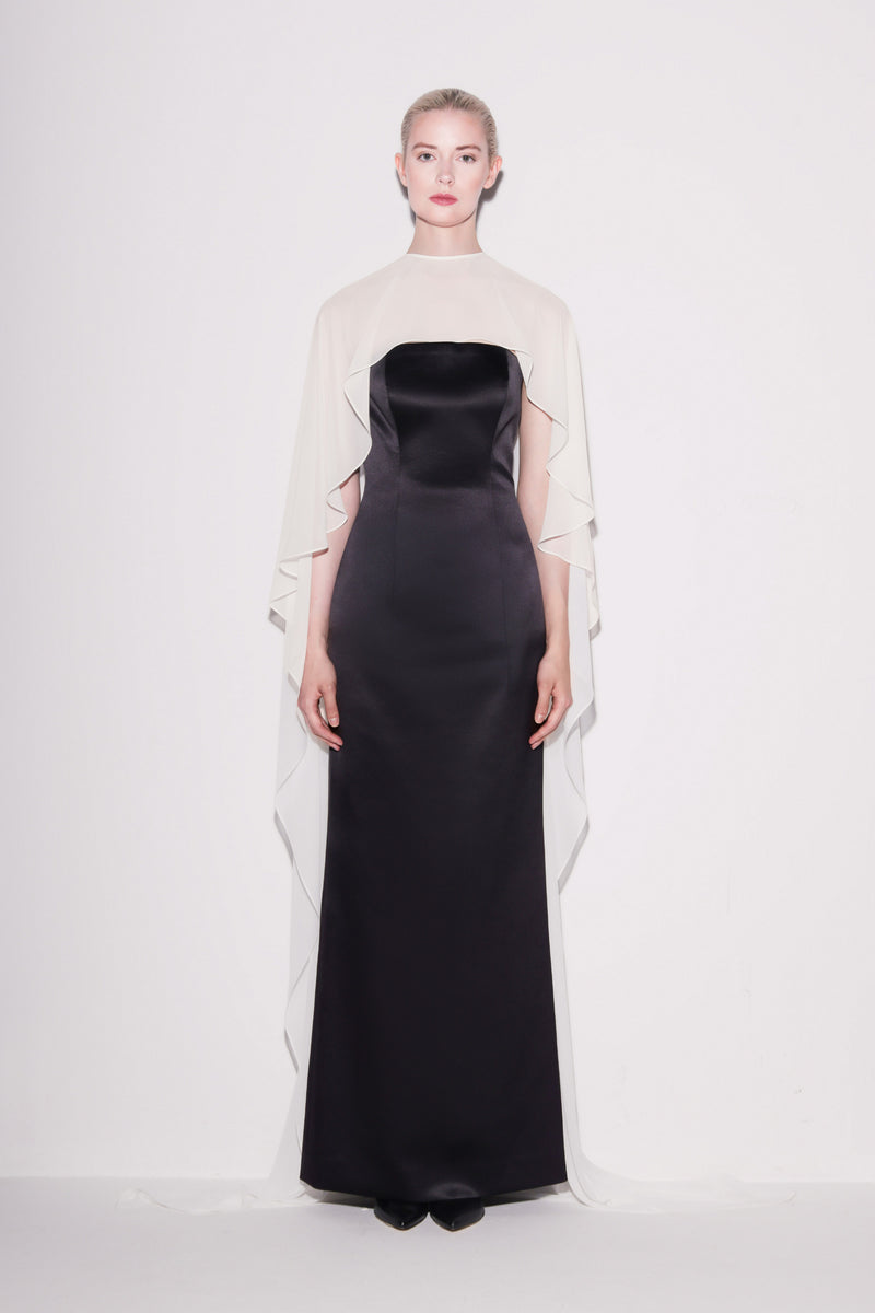 In lustrous black taffeta, this gown features a sleek silhouette complemented by a soft white chiffon cape. Fully fitted with a discreet back zipper, it exudes modern elegance and ethereal grace.