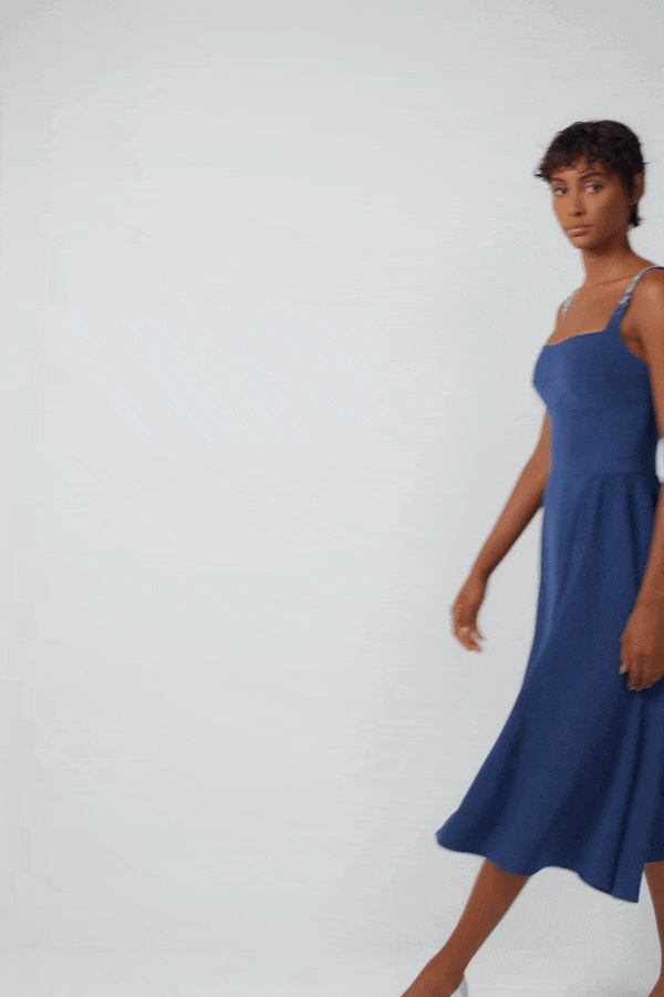 Embrace elegance with our "Feminine Charm Midi Dress." This luxurious crepe design features a chic squared neckline, flattering side waist gathers, and delicate crystal applications on the shoulder stripes, ensuring you shine at any evening event.