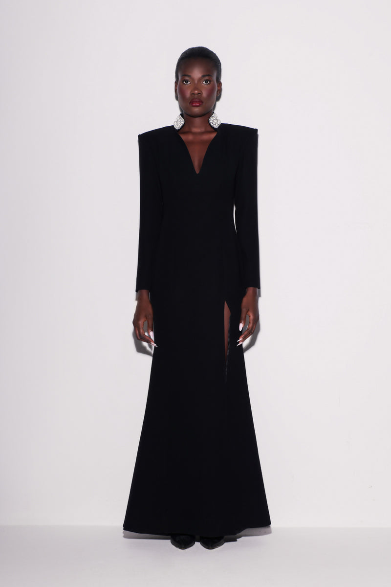Sculpted in thick crepe, this evening gown features a mermaid silhouette, high slit, and crystal-embellished shoulders and neckline. Fully lined with a concealed zipper, it exudes modern glamour.