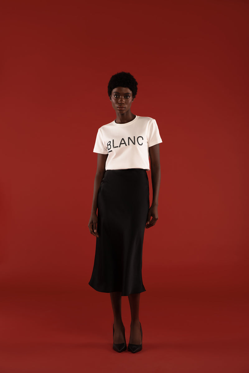 Make a statement with our Glamour Duo Skirt Set, featuring a jersey top embellished with a sparkling logo in crystals and a sleek satin midi skirt. This chic ensemble balances comfort and sophistication, perfect for any occasion.