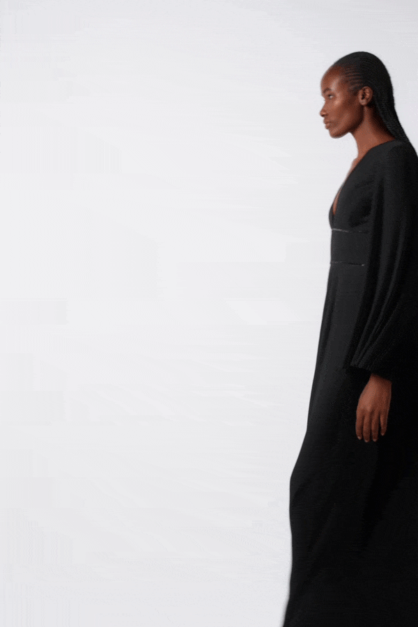 Radiate elegance in our "Glistening Pleat Maxi Dress." This luxurious pleated chiffon design features a stunning deep V neckline and wide sleeves, adorned with delicate crystal applications that enhance its graceful silhouette for an enchanting evening look.