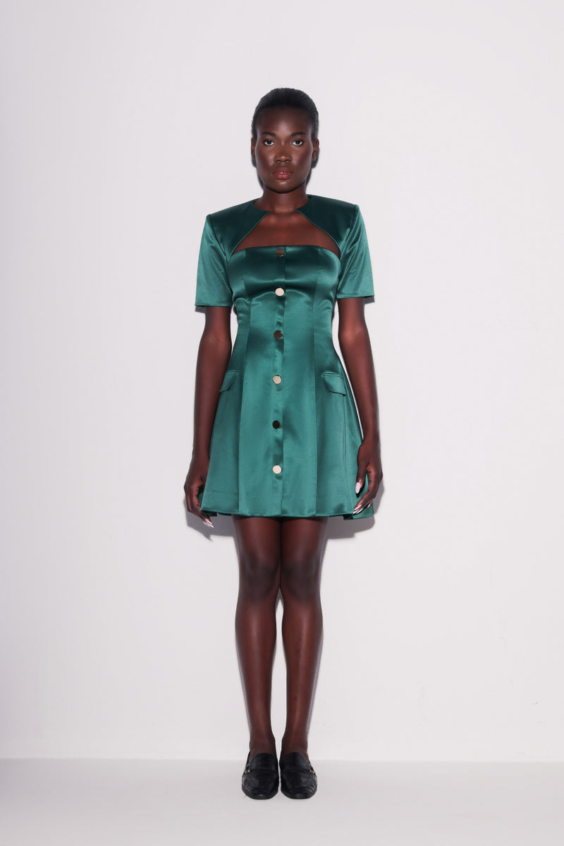 This glossy taffeta mini dress features a strapless bodice and feminine A-line shape. With a statement front button and sleek back zipper, it pairs beautifully with a matching bolero for a modern layered look.