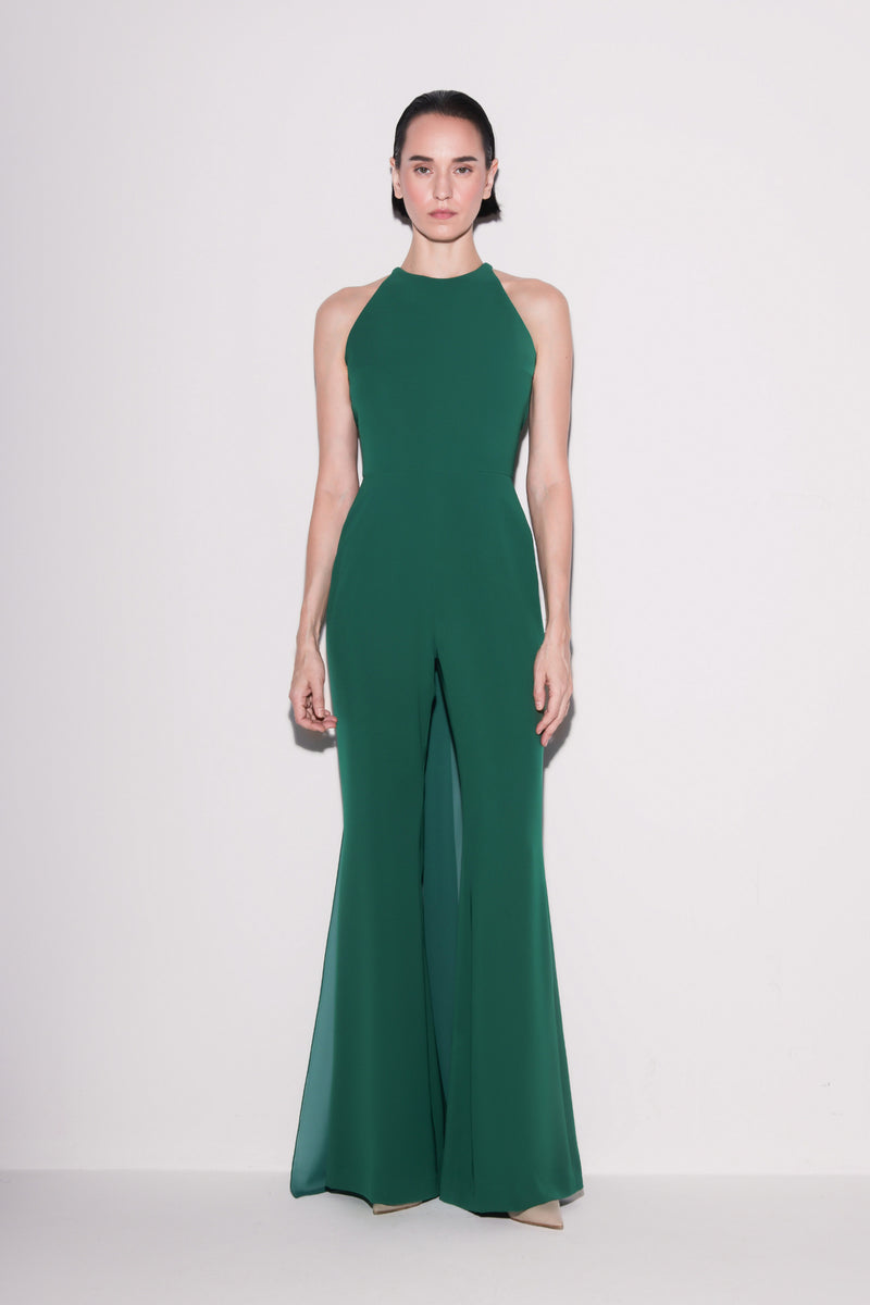 In thick crepe, this fitted green jumpsuit offers a rounded neckline and wide-leg silhouette for a sleek, elongated look. A chiffon cape adds ethereal elegance, while a discreet back zipper ensures a flawless fit.