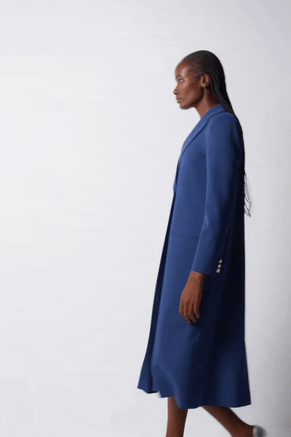 Make a statement with our "Iconic Elegance Coat." This luxurious crepe maxi coat features the signature Lili Blanc collar and stunning center front crystal buttons, blending sophistication and style for a truly stunning look.