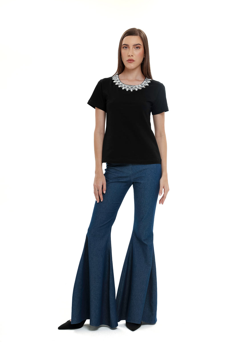 An iconic crystal detail on the crew neck T-shirt, adds a touch of glamour and elevates the look of the classic tee, with on-trend Blue Denim Bell Trousers, designed to give you a tall and elegant look. Crafted from high-quality denim fabric, these trousers offer a comfortable and durable fit.