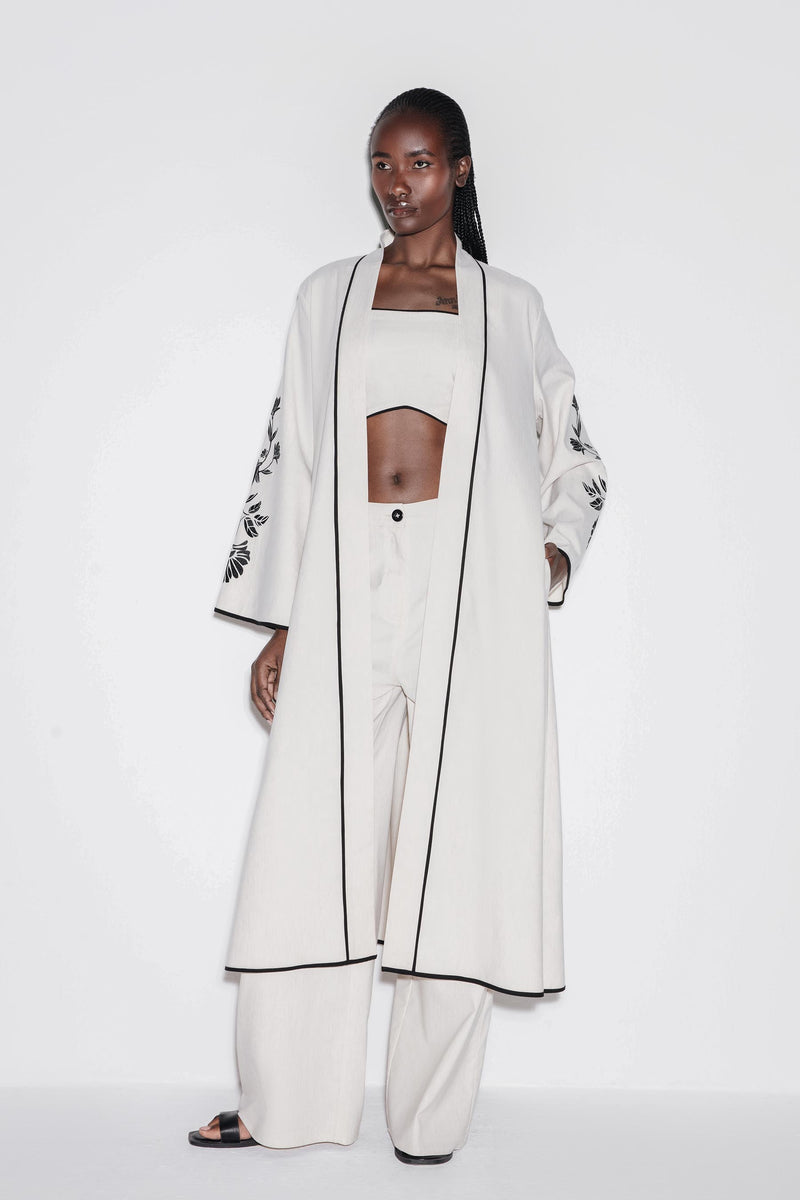 Experience effortless elegance with our ”Linen Floral Co-Ord." This chic set features a linen maxi kimono with wide sleeves and intricate floral embroidery, paired with a stylish cropped top featuring contrasting piping, and high-waisted straight-leg trousers for a sophisticated look perfect for any occasion.