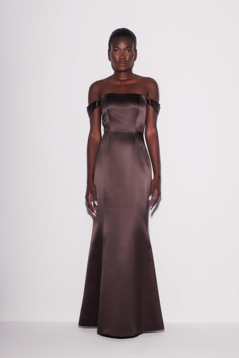 In lustrous taffeta, this off-shoulder gown features a fitted bodice and mermaid silhouette. Fully lined with a back zipper, it exudes timeless elegance and feminine allure.