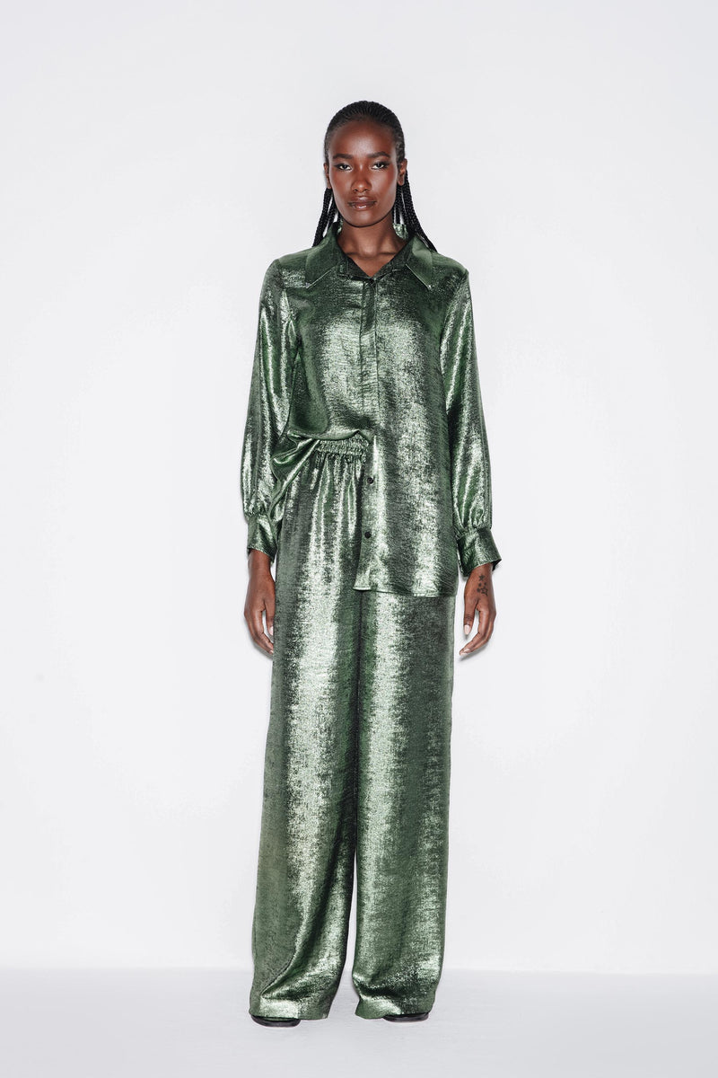 These metallic crepe high-waisted wide-leg trousers feature an elasticated waistband and crystal application on the side leg seam for a touch of glamour. Styled as part of the Metallic Luxe Ensemble, they complement the regular shirt for a refined and striking look.