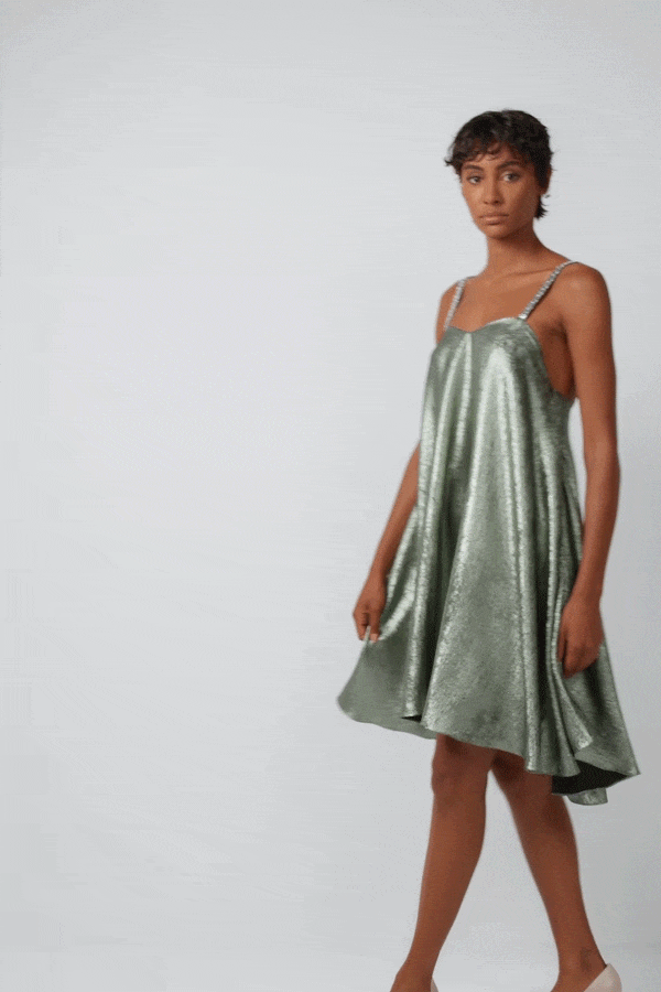 Step into the spotlight with our "Metallic Luxe Mini Dress." This stunning metallic crepe design features a flattering sweetheart neckline and a daring open back, adorned with exquisite crystal applications for a glamorous look that radiates sophistication.