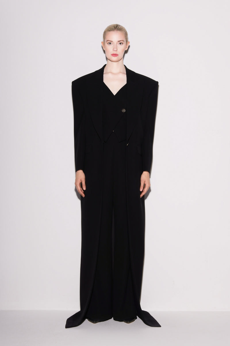 This thick crepe vest combines refined structure with minimalist elegance. Its asymmetric front, pointed hem, and single statement button add architectural detail, perfect for layering or wearing alone—blending tailored polish with modern allure.