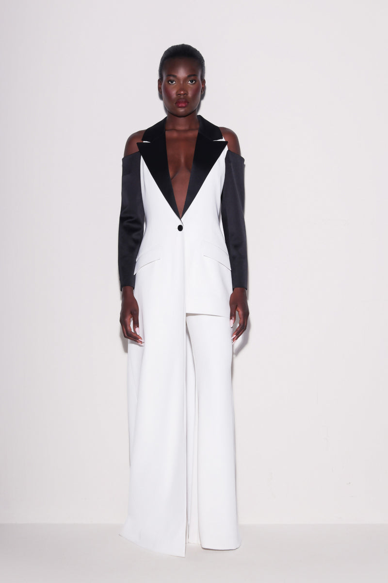 Effortlessly refined, this tailored blazer from Lili Blanc in thick and satin crepe features asymmetrical cuts and bold contrast panels. Fully lined and fastened with a single button, it embodies modern elegance with architectural sophistication.