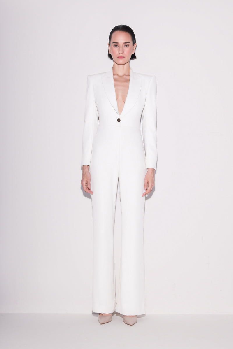 In thick crepe, this wide-leg jumpsuit with sharp shoulders offers a sleek silhouette and confident elegance. Fully lined with a discreet side zipper, it blends modern sophistication with timeless precision.
