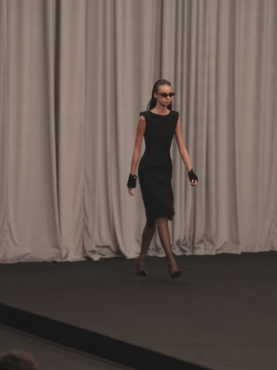 Embrace effortless elegance with our sleeveless midi dress, featuring a clean high neckline and minimalist finish. The structured shoulder silhouette and fitted bodice with contoured waist shaping enhance your figure, while the front slit detail adds a modern touch. Crafted from luxurious thick crepe for a sophisticated look.