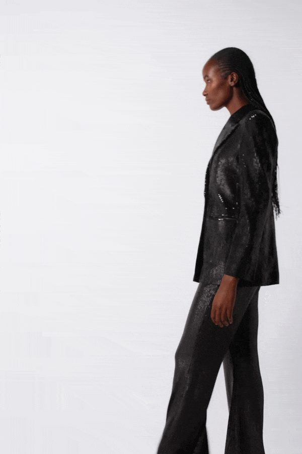 Unveil your inner glam with our "Opulent Allure Suit." This luxurious ensemble features a straight-fit double-breasted blazer and high-waisted flared trousers, both adorned with dazzling sequins. Perfect for making a breathtaking statement at any soirée.