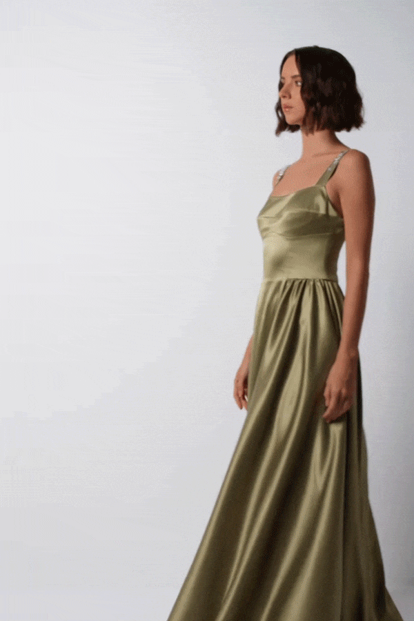 Embrace your inner royalty in our "Princess Elegance Maxi Dress." This luxurious satin evening gown features a squared neckline, flattering side waist gathers, and exquisite crystal applications on the shoulder stripes, making it the ultimate choice for a truly enchanting look.