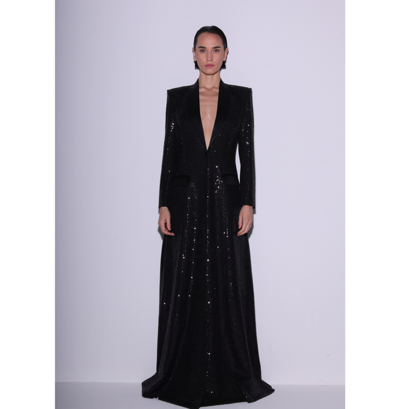 A stunning reimagining of elegance, this shimmering sequin coat features structured shoulders, a peak lapel, and a sleek single-button closure. Perfect for evening occasions, it commands attention with timeless glamour and architectural sophistication.