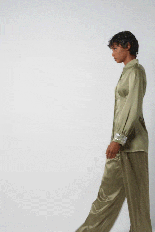 A satin crepe shirt featuring a shaped waist detail and crystal application on the cuff. Styled as part of the Refined Satin Set, it pairs seamlessly with the matching high-waisted wide-leg trousers for a chic and sophisticated look.