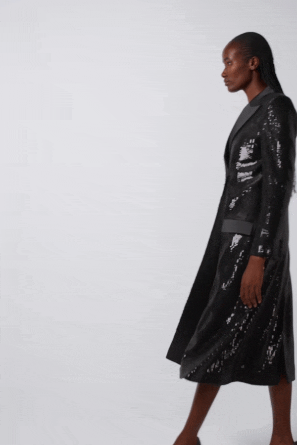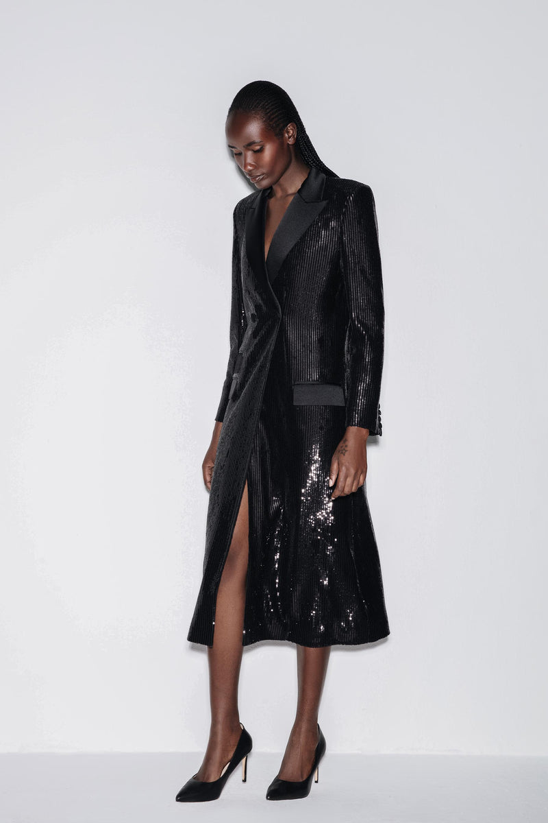 Make a statement with our "Satin Glam Coat Dress." This luxurious single-breasted coat is adorned with sequins and features elegant satin triple flap pockets, blending sophistication and modern style for a truly upscale look.