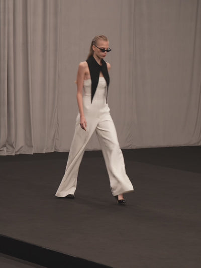 Elevate your presence in our full-length strapless jumpsuit, featuring a sculptural contrasting panel and the iconic Lili Blanc collar. The fitted bodice with defined waist flows into wide-leg trousers with an elongated straight cut, while exposed shoulders and minimal seam detailing create a striking balance of structure and fluidity in thick crepe.