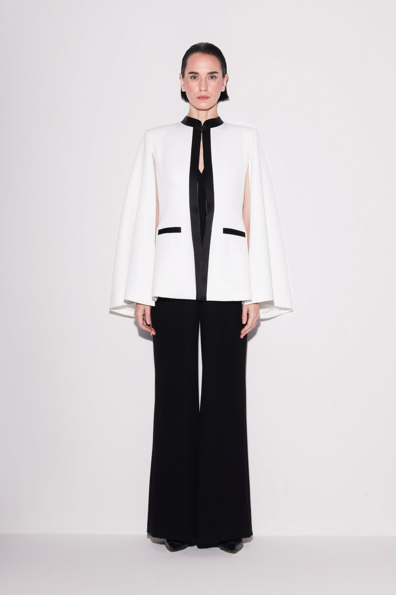 Crafted from thick crepe, this cape blazer combines sharp tailoring with modern elegance. Its structured silhouette, satin accents, and discreet hook redefine refined power dressing.