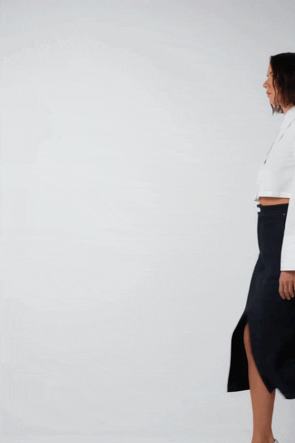 Introducing the "Sleek Denim Midi Skirt," a high-waisted pencil skirt that effortlessly combines style and comfort. With a chic center front slit and minimalistic crystal embellishments on the pocket profiles, this skirt adds a touch of allure to any ensemble.