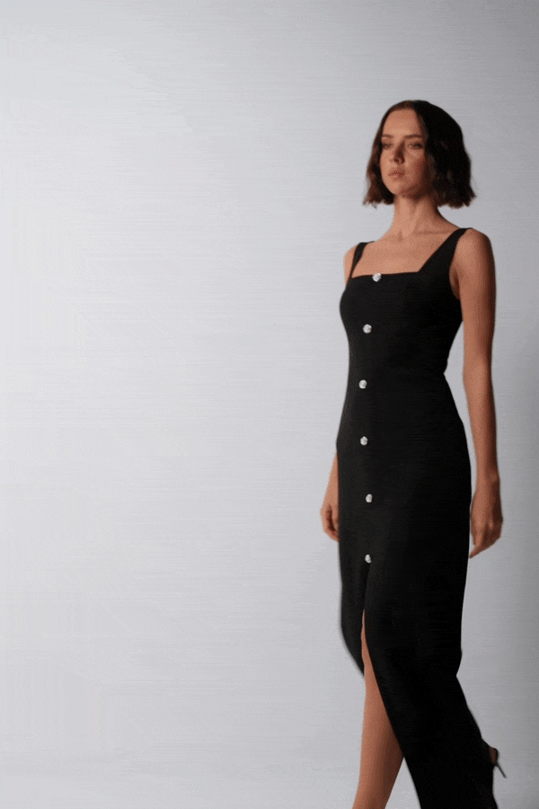 Embrace timeless elegance in our "Sophisticated Splendor Maxi Dress." This luxurious crepe design features a stylish squared neckline and a sultry center front slit, adorned with exquisite crystal buttons that enhance its refined silhouette, perfect for any glamorous occasion.