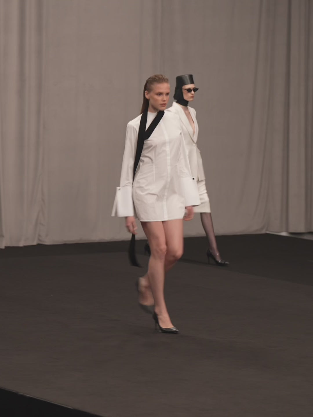 Elevate your look with this mini dress, featuring a high close neckline, tailored silhouette, precise front detailing, and exaggerated cuffs for controlled volume. Short-length hemline and clean lines create a modern, polished finish.