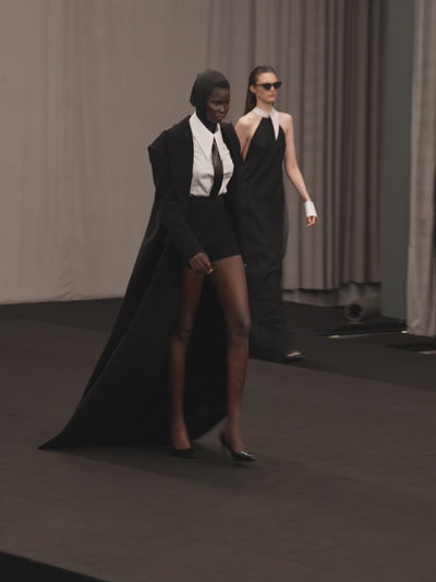Command attention with this long tailored coat, featuring padded extended shoulders, a sharp Lili Blanc collar, and an elongated cut for defined proportions. Sleek, structured, and modern.