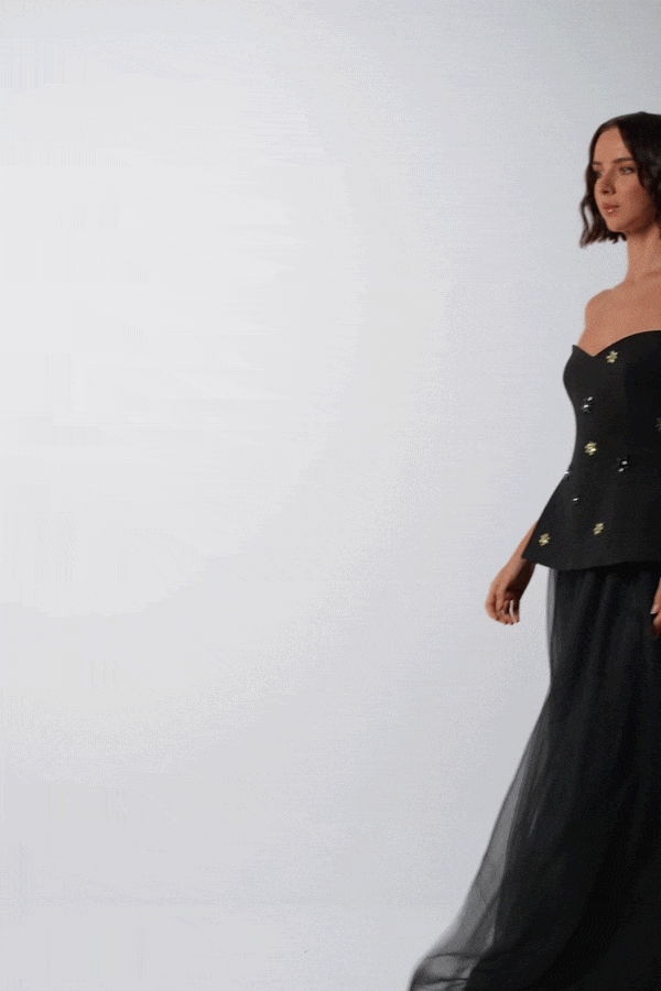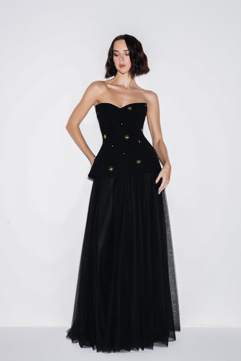 - Maxi dress with taffeta shaped corset with crystal application and maxi skirt with tulle layers