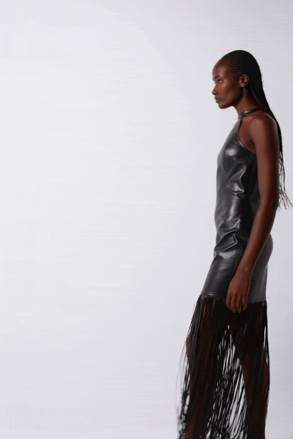 Turn heads in our ”Vegan Leather Fringe Maxi Dress." This stunning fitted maxi dress crafted from premium vegan leather features a dramatic fringed skirt, combining edgy sophistication with effortless elegance for a captivating look at any event.