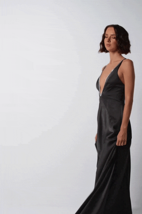 Step into sophistication with our "Vivid Allure Maxi Dress." This luxurious satin crepe evening gown features a deep V neckline and an alluring open back, adorned with crystal applications that add a touch of glamour to your elegant ensemble.